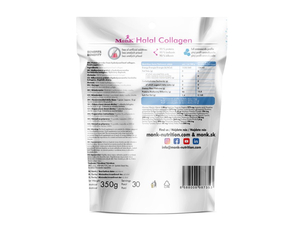 Vysoko účinný, čistý prírodný hovädzí kolagén pre krásu, zdravie a vitalitu – to je Monk Halal Collagen! Dodajte svojmu telu dávku kvalitného čistého hovädzieho kolagénu plného bielkovín a naštartujte tak omladzujúce procesy, ktoré vám zaistia krásu a skvelú kondíciu, pleťou počínajúc a pružnými a ohybnými kĺbmi končiac. Prírodný hovädzí kolagén v tej najvyššej kvality a čistoty, vyrobený pomocou hydrolýzy, bez akýchkoľvek ďalších prímesí, bez lepku a laktózy, sladidiel či konzervantov. 100% čistý prírodný kolagén vo forme prášku stačí už len rozpustiť vo vode a nechať si telo načerpať všetky jeho benefity.